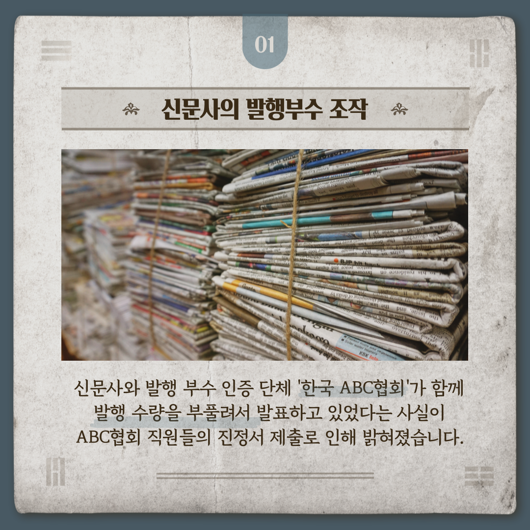 신문사와 발행 부수 인증 단체 ‘한국 ABC협회’가 함께 발행 수량을 부풀려서 발표하고 있었다는 사실이 ABC협회 직원들의 진정서 제출로 인해 밝혀졌습니다.