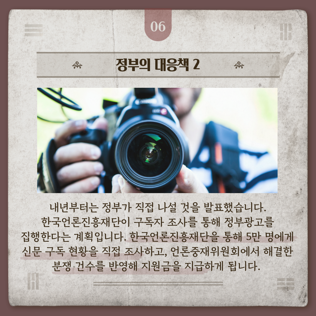 내년부터는 정부가 직접 나설 것을 발표했습니다. 한국언론진흥재단이 구독자 조사를 통해 정부광고를 집행한다는 계획입니다. 한국언론진흥재단을 통해 5만 명에게 신문 구독 현황을 직접 조사하고, 언론중재위원회에서 해결한 분쟁 건수를 반영해 지원금을 지급하게 됩니다.