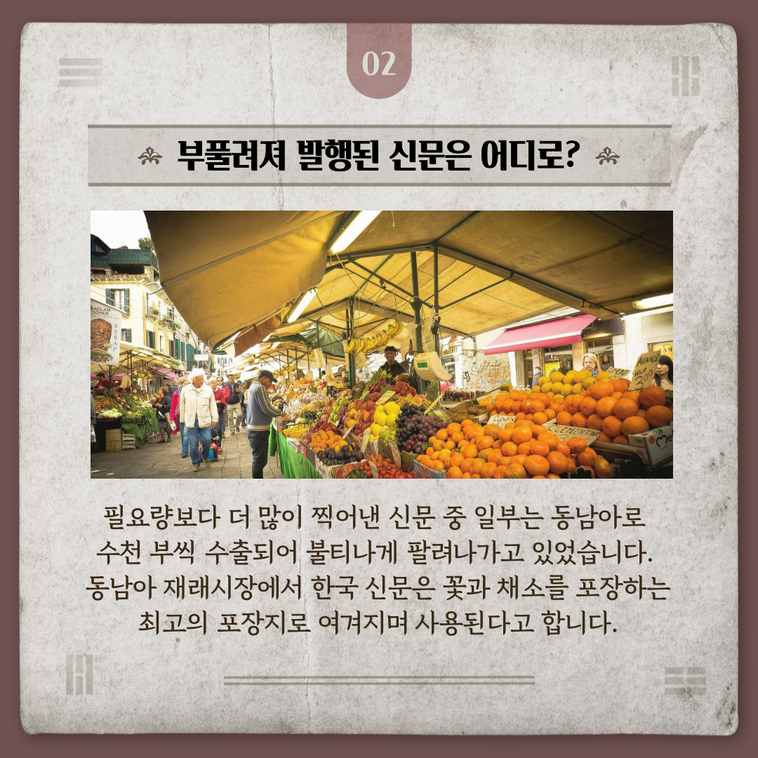 필요량보다 더 많이 찍어낸 신문 중 일부는 동남아로 수천 부씩 수출되어 불티나게 팔려나가고 있었습니다. 동남아 재래시장에서 한국 신문은 꽃과 채소를 포장하는 최고의 포장지로 여겨지며 사용된다고 합니다.