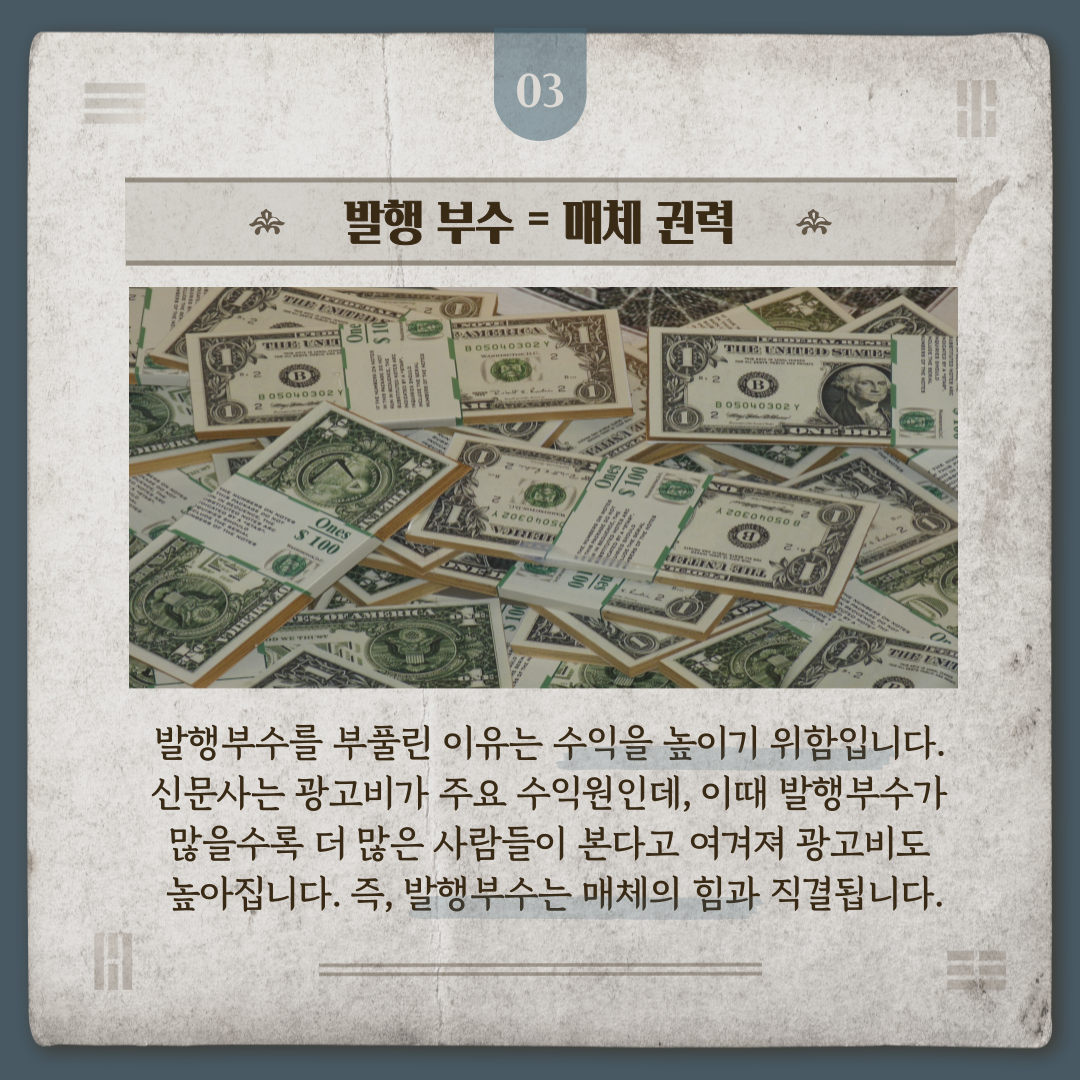 발행부수를 부풀린 이유는 수익을 높이기 위함입니다. 신문사는 광고비가 주요 수익원인데, 이때 발행부수가 많을수록 더 많은 사람들이 본다고 여겨져 광고비도 높아집니다. 즉, 발행부수는 매체의 힘과 직결됩니다.