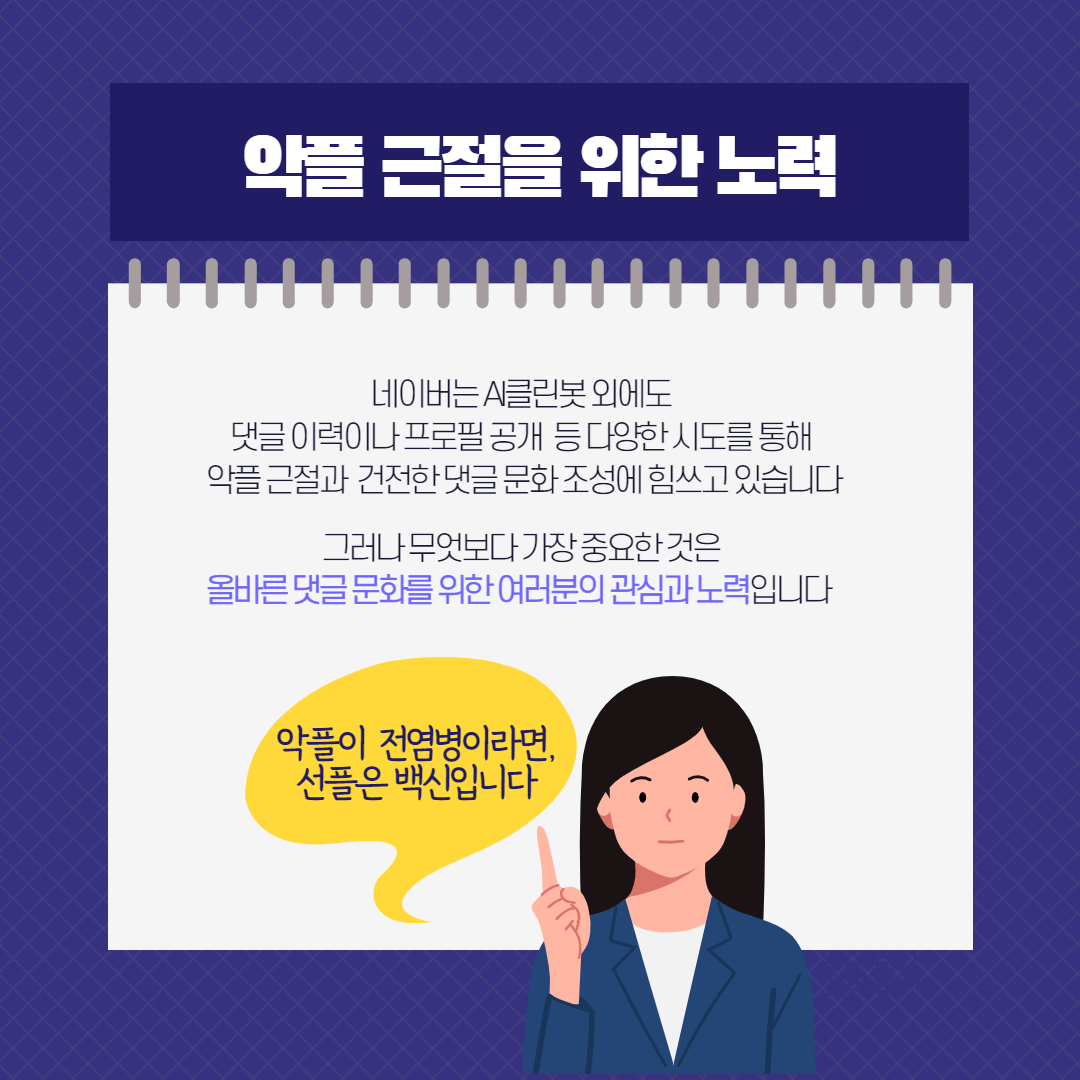 네이버는 AI클린봇 외에도 댓글 이력이나 프로필 공개 등 다양한 시도를 통해 악플 근절과 건전한 댓글 문화 조성에 힘쓰고 있습니다. 그러나 무엇보다 가장 중요한 것은 올바른 댓글 문화를 위한 여러분의 관심과 노력입니다.