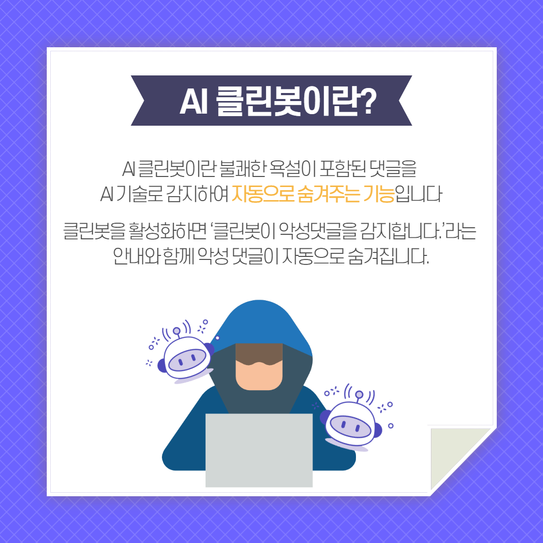 불쾌한 욕설이 포함된 댓글을 AI 기술로 감지하여 자동으로 숨겨주는 기능입니다. 클린봇을 활성화하면 ‘클린봇이 악성댓글을 감지합니다’라는 안내와 함께 악성 댓글이 자동으로 숨겨집니다.