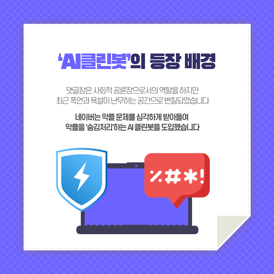 댓글창은 사회적 공론장으로서의 역할을 하지만 최근 폭언과 욕설이 난무하는 공간으로 변질되었습니다. 네이버는 악플 문제를 심각하게 받아들여 악플을 ‘숨김처리’하는 AI 클린봇을 도입했습니다.