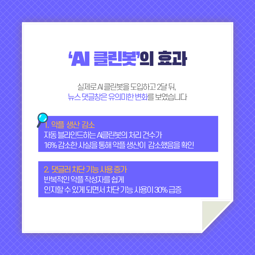 악플 생산 감소: 자동 블라인드하는 AI 클린봇의 처리 건수가 16% 감소한 사실을 통해 악플 생산이 감소했음을 확인