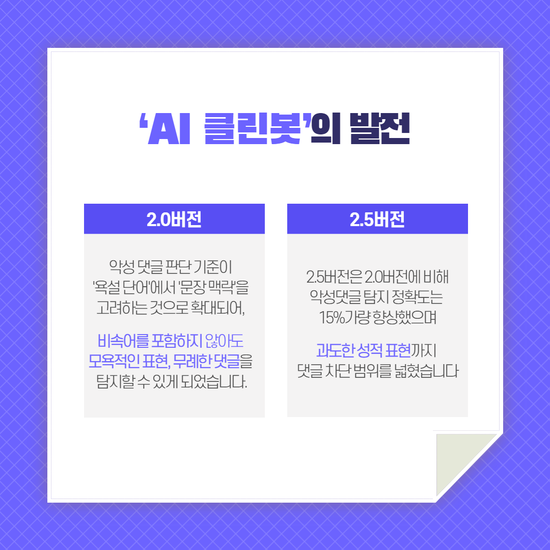 2.5버전: 2.5버전은 2.0버전에 비해 악성댓글 탐지 정확도는 15%가량 향상했으며 과도한 성적 표현까지 댓글 차단 범위를 넓혔습니다.