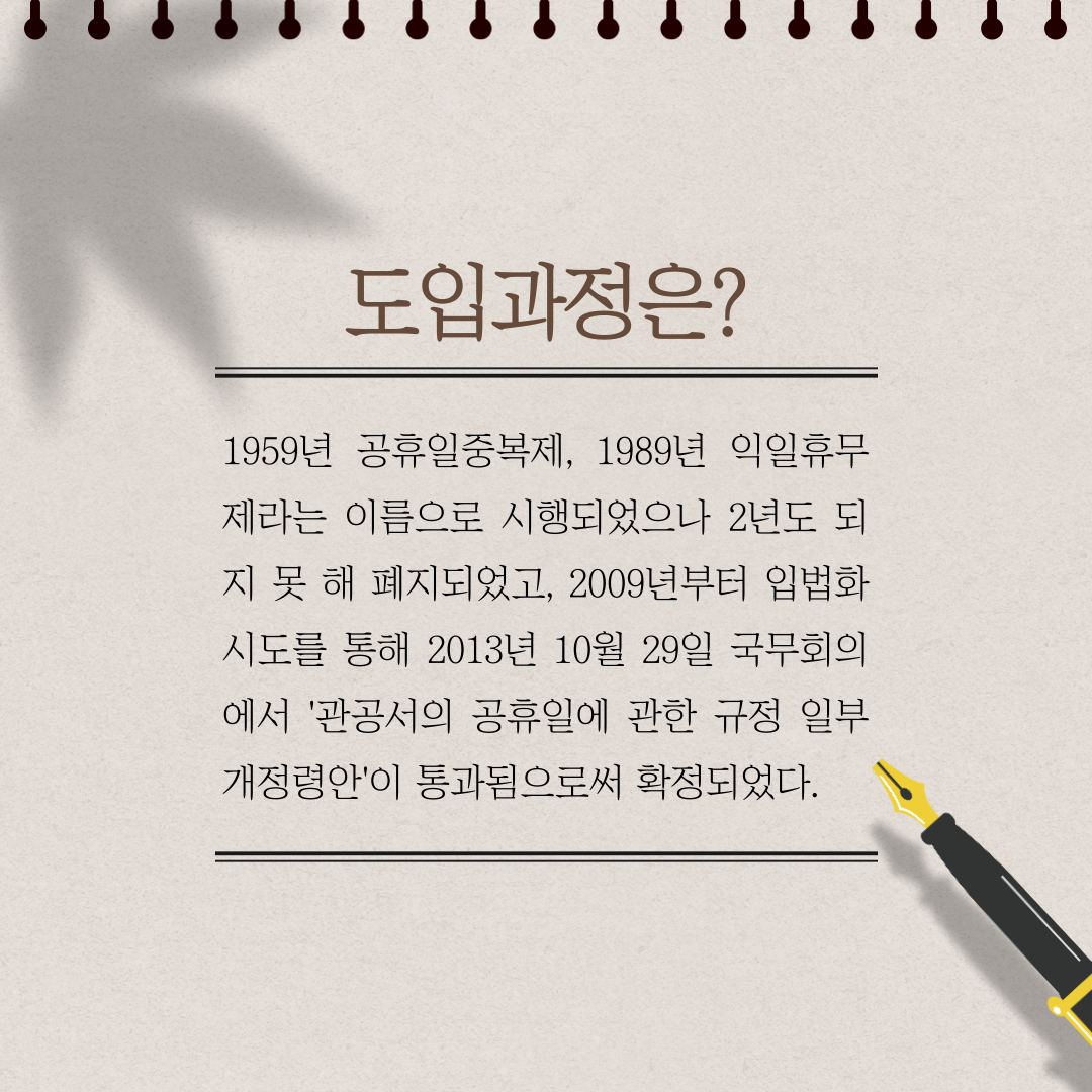 3. 도입과정은?/ 1959년 공휴일중복제, 1989년 익일휴무제라는 이름으로 시행되었으나 2년도 되지 못 해 폐지되었고, 2009년부터 입법화 시도를 통해 2013년 10월 29일 국무회의에서 '관공서의 공휴일에 관한 규정 일부개정령안'이 통과됨으로써 확정되었다.