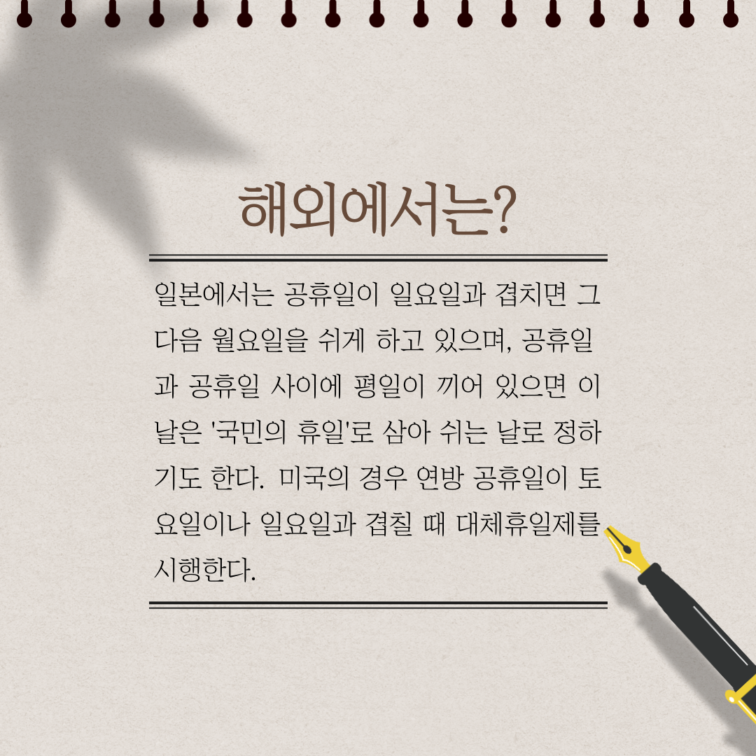 6. 해외에서는?/ 일본에서는 공휴일이 일요일과 겹치면 그 다음 월요일을 쉬게 하고 있으며, 공휴일과 공휴일 사이에 평일이 끼어 있으면 이날은 '국민의 휴일'로 삼아 쉬는 날로 정하기도 한다. 미국의 경우 연방 공휴일이 토요일이나 일요일과 겹칠 때 대체휴일제를 시행한다.