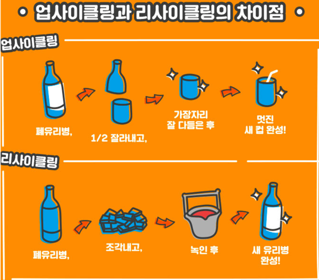 업그레이드(Upgrade)와 재활용(Recycle)의 합성어로 재활용의 확대된 개념으로 재활용품에 디자인 또는 활용도를 더해 그 가치를 높여 재탄생시키는 ‘전혀 다른 제품’으로 만드는 것을 의미합니다. 그 예로, 재활용 의류로 옷과 가방을 만들고, 버려진 현수막을 활용해서 크로스백을 만들어 재사용하는 방법 등이 있습니다.