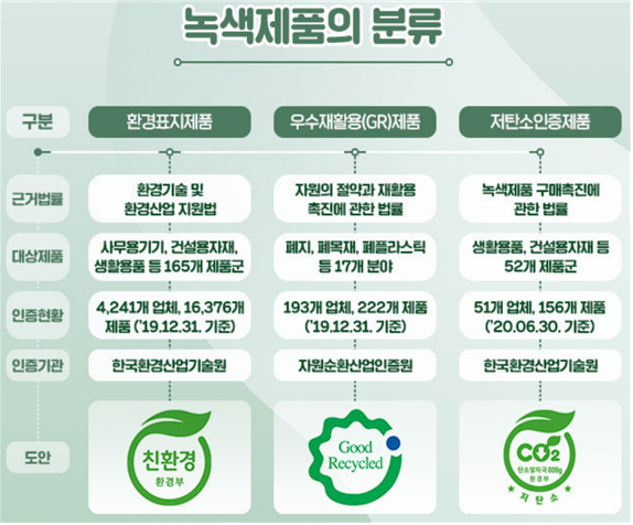 녹색제품이란 에너지 소비와 온실가스 및 오염물질 발생을 최소화하는 제품을 의미하는 것으로 같은 용도의 다른 제품에 비하여 제품의 환경성을 개선하여 환경표지를 받은 제품이다. ‘환경표지 인증제품’, ’우수재활용 인증제품’, ’저탄소 인증제품’으로 구성됩니다.