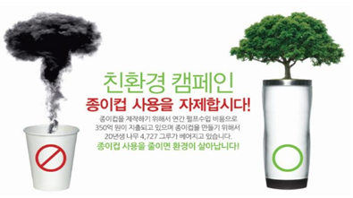 우리는 위생과 편리함 때문에 카페에서 일회용 플라스틱 컵이나 종이컵에 담아 테이크 아웃을 하거나, 휴게실 내 정수기 물을 이용시 종이컵을 사용하고 있지만, 이제 조금씩 줄여나갈 필요가 있습니다. 2년간 텀블러 사용할 경우 CO2 발생량 일회용 플라스틱 컵보다 33배, 일회용 종이컵보다 18배 줄일 수 있습니다. 국립산림과학원에 따르면 30년생 소나무 1그루는 연간 6.6kg의 이산화탄소를 흡수한다고 합니다. 일회용 플라스틱 컵을 하루 한 개씩 1년간 사용할 경우 발생하는 이산화탄소는 약 19kg이니, 일회용 컵 대신 텀블러를 사용하는 작은 행동의 환경적 가치가 결코 작지 않습니다.