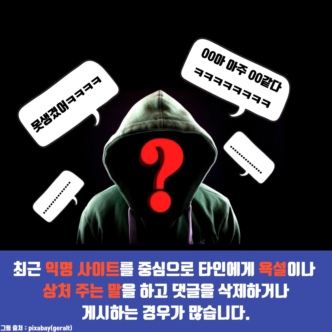 최근 익명 사이트를 중심으로 타인에게 욕설이나 상처 주는 말을 하고 댓글을 삭제하거나 게시하는 경우가 많습니다.