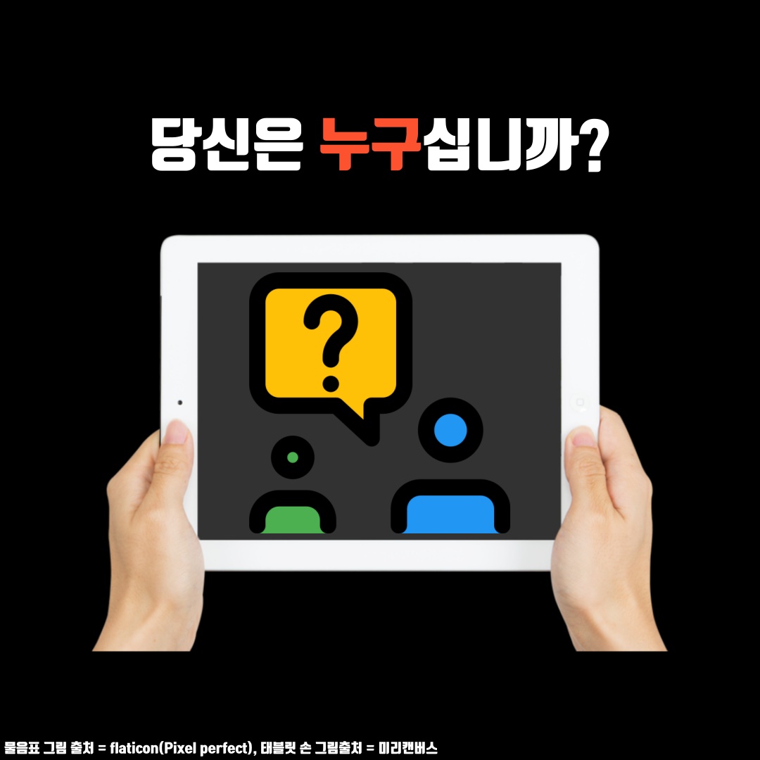 (누구냐고 묻는 질문과 함께 인터넷 세상을 암시하기 위해 태블릿을 잡고 있는 손 모양을 이용)