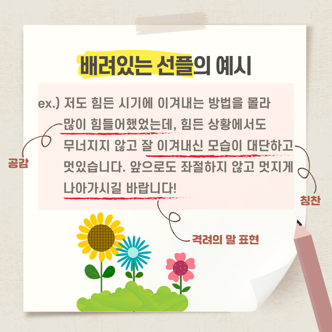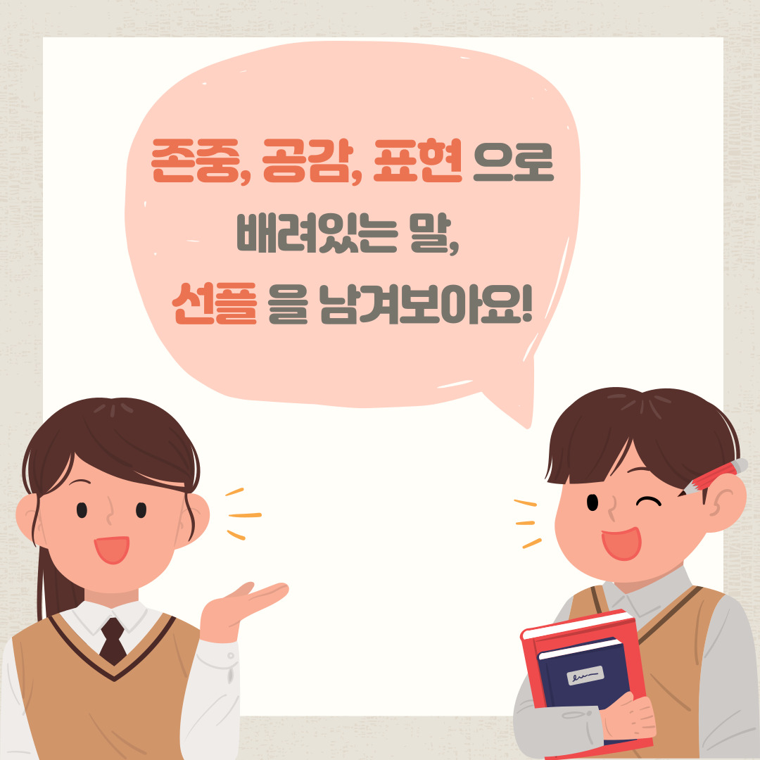 어떠신가요? 배려있는 말에 대해 이해가 가셨다면, 존중, 공감, 표현으로 배려심있는 말을 선플로 남겨보시는 건 어떨까요?