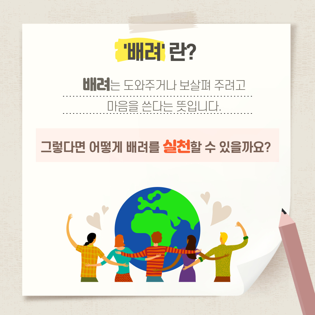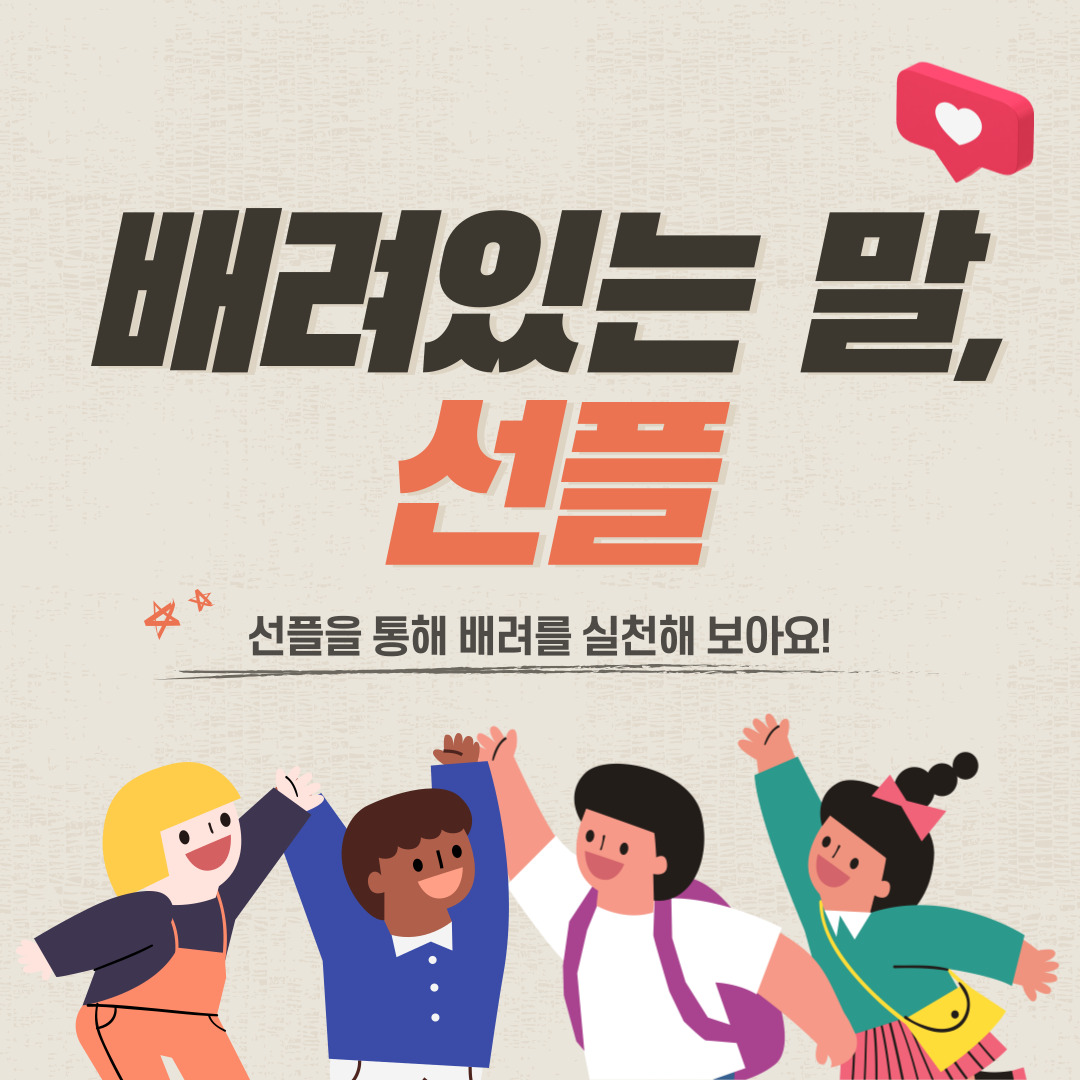 배려란? 배려는 도와주거나 보살펴 주려고 마음을 쓴다는 뜻입니다. 그렇다면 어떻게 배려를 실천할 수 있을까요? 배려를 실천하는 방법으로는 다른 사람을 존중하는 마음을 가지고 공감한 마음을 표현하는 것으로 실천할 수 있습니다! 바로, 선플 작성을 통해 실천이 가능합니다.