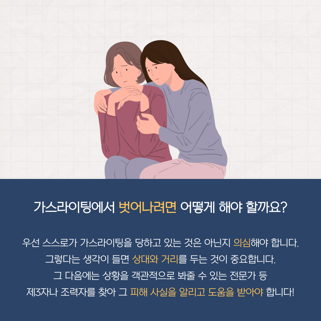 우선 스스로가 가스라이팅을 당하고 있는 것은 아닌지 의심해야 합니다. 그렇다는 생각이 들면 상대와 거리를 두는 것이 중요합니다. 다음에는 상황을 객관적으로 봐줄 수 있는 전문가 등 제삼자나 조력자를 찾아 그 피해 사실을 알리고 도움을 받아야 합니다!