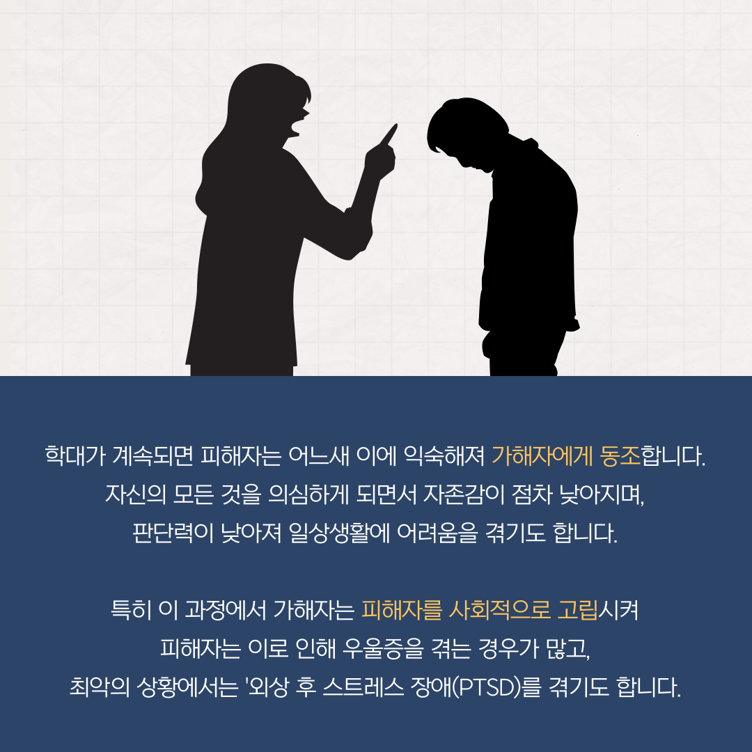 학대가 계속되면 피해자는 어느새 이에 익숙해져 가해자에게 동조합니다. 자신의 모든 것을 의심하게 되면서 자존감이 점차 낮아지며, 판단력이 낮아져 일상생활에 어려움을 겪기도 합니다. 특히 이 과정에서 가해자는 피해자를 사회적으로 고립시켜 피해자는 이로 인해 우울증을 겪는 경우가 많고, 최악의 상황에서는 '외상 후 스트레스 장애(PTSD)를 겪기도 합니다.