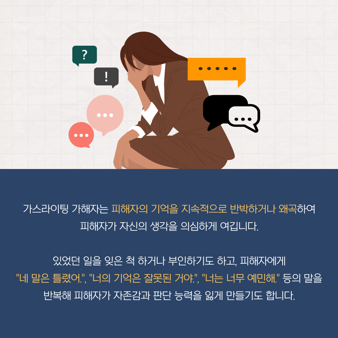 가스라이팅 가해자는 피해자의 기억을 지속적으로 반박하거나 왜곡하여 피해자가 자신의 생각을 의심하게 여깁니다. 있었던 일을 잊은 척 하거나 부인하기도 하고, 피해자에게 "네 말은 틀렸어.", "너의 기억은 잘못된 거야.", "너는 너무 예민해." 등의 말을 반복해 피해자가 자존감과 판단 능력을 잃게 만들기도 합니다.