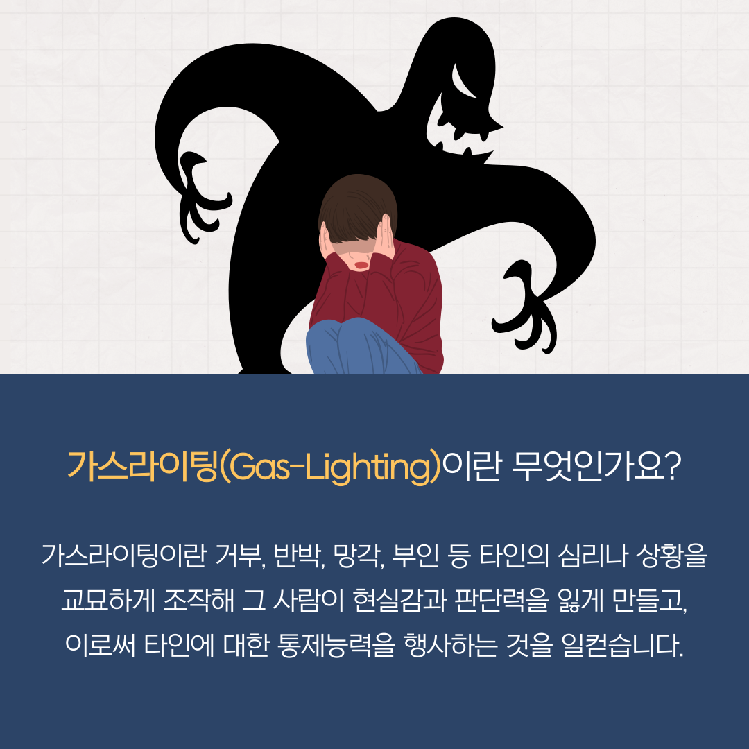 가스라이팅이란 거부, 반박, 망각, 부인 등 타인의 심리나 상황을 교묘하게 조작해 그 사람이 현실감과 판단력을 잃게 만들고, 이로써 타인에 대한 통제능력을 행사하는 것을 일컫습니다.