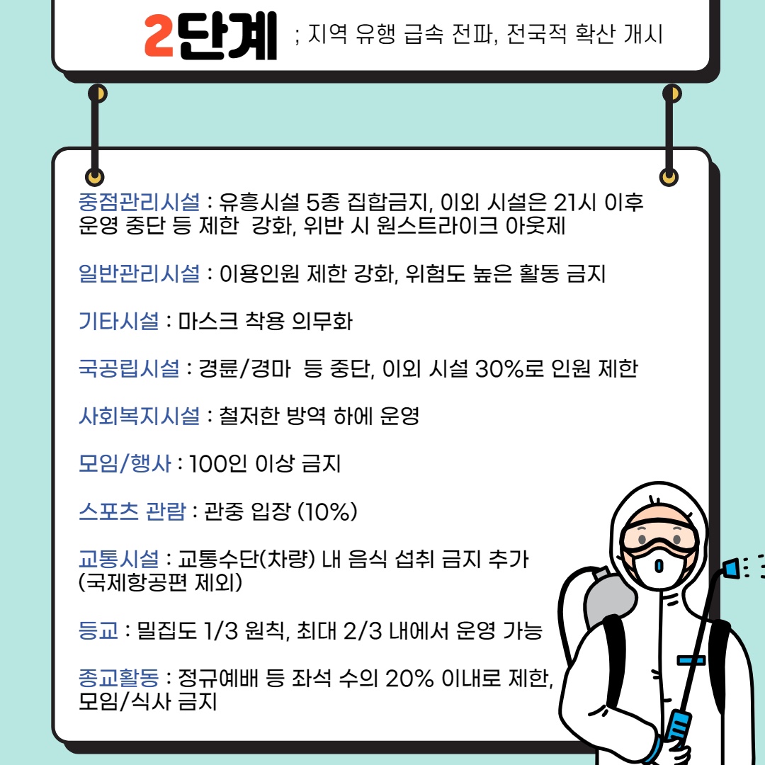5. 2단계는 지역 유행이 급속으로 전파되고 전국적으로 확산되는 단계입니다. 이때 유흥시설 5종은 집합이 금지되며, 이외의 시설은 21시 이후 운영이 중단되는 등 제한을 강화하고, 위반 시 원스트라이크 아웃제가 적용됩니다. 일반관리시설은 이용인원의 제한을 강화하고 위험도가 높은 활동을 금지하며, 기타시설은 마스크 착용이 의무화됩니다. 경륜, 경마 등 국공립시설은 중단되며 이외 시설은 30%로 인원이 제한되고, 사회복지시설은 철저한 방역 하에 운영합니다. 100인 이상 모임이나 행사는 금지되며, 스포츠 관람 시 관중의 입장은 10%로 제한되고, 교통수단 내 음식 섭취가 금지됩니다. 등교 시 밀집도는 1/3이 원칙이지만 최대 2/3 내에서 운영 가능하며, 종교활동 예배 인원은 좌석 수의 20% 이내로 제한, 모임과 식사는 금지입니다.