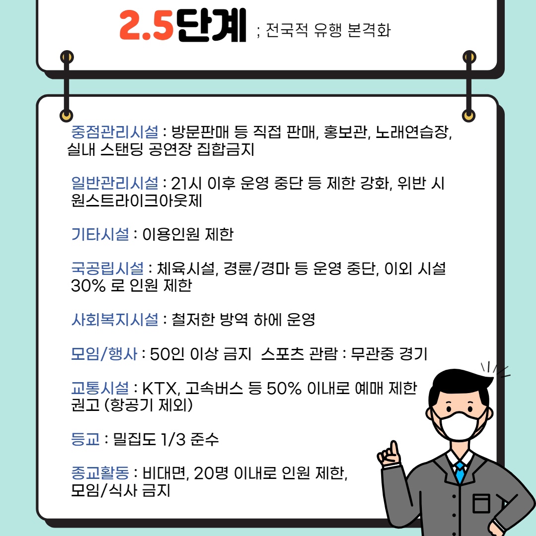 6. 다음은 2.5단계로, 전국적 유행이 본격화되는 시기인데요. 중점관리시설은 방문판매 등 직접판매, 홍보관, 노래연습장, 실내 스탠딩 공연장이 집합금지되며, 일반관리시설은 21시 이후 운영 중단 등 제한이 강화되고, 위반 시 원스트라이크 아웃제가 적용됩니다. 기타시설은 이용 인원이 제한되고, 체육시설과 경륜, 경마 등 국공립시설은 운영이 중단되며, 이외 시설은 인원이 30%로 제한됩니다. 사회복지시설은 철저한 방역 하에 운영하며, 50인 이상의 모임과 행사는 금지되고, 스포츠 관람은 관중 없이 경기가 진행됩니다. KTX, 고속버스 등 항공기를 제외한 교통시설은 50% 이내로 예매가 제한되고, 등교 밀집도는 1/3을 준수해야 합니다. 종교활동은 비대면 또는 20명 이내로 인원을 제한합니다.