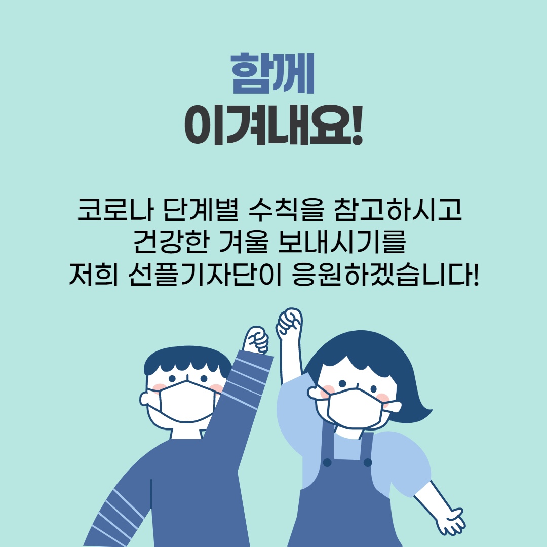 8. 지금까지 코로나 단계별 수칙을 알아보았는데요. 이를 참고하여 건강한 겨울 보내시기를 저희 선플기자단이 응원하겠습니다. 함께 이겨내요!