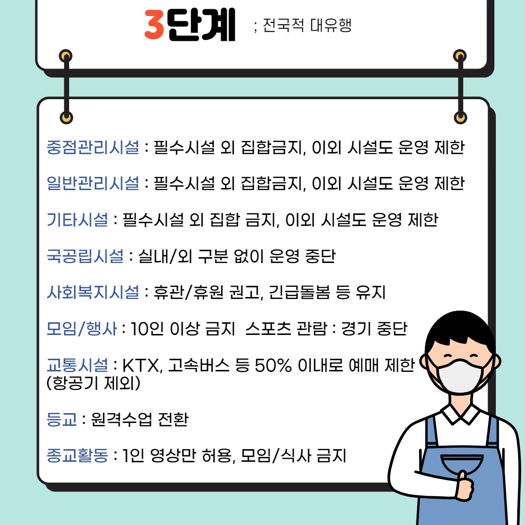 7. 마지막으로는 전국적으로 대유행하는 3단계입니다. 중점관리시설, 일반관리시설, 기타시설은 필수 시설 외 집합이 금지되며, 이외 시설도 운영이 제한됩니다. 국공립시설은 실내/외 구분 없이 운영이 중단되고, 사회복지시설은 휴관 또는 휴원이 권고되며 긴급 돌봄 등이 유지됩니다. 또한 10인 이상 모임이나 행사가 금지되며, 스포츠는 경기를 중단하고, KTX, 고속버스 등 항공기를 제외한 교통시설은 50% 이내로 예매를 제한합니다. 학교는 원격수업으로 전환하며, 종교 활동은 1인 영상만 허용됩니다.