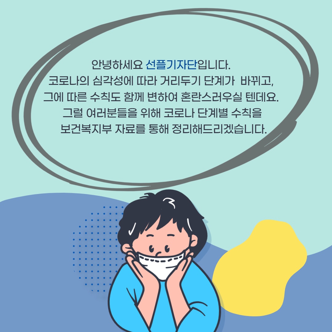 2. 안녕하세요, 선플기자단입니다. 코로나의 심각성에 따라 거리두기 단계가 바뀌고, 그에 따른 수칙도 함께 변하면서 많은 분들이 혼란스러우실 텐데요. 그럴 여러분들을 위해 저희 선플기자단이 코로나 단계별 수칙을 보건복지부 자료를 통해 정리해보았습니다.