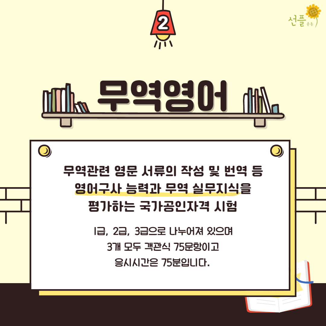 무역영어는 무역관련 영문 서류의 작성 및 번역 등 영어구사 능력은 물론 무역 실무지식을 평가하는 국가공인자격 시험입니다. 이 자격증은 1급, 2급, 3급으로 나누어져 있고 모두 다 필기시험입니다. 시험과목은 1급, 2급, 3급 모두 객관식 75문항으로 이루어져 있고 90분 동안 시험을 봅니다. 응시료는 1급, 2급, 3급 모두 동일하게 29,000원입니다.